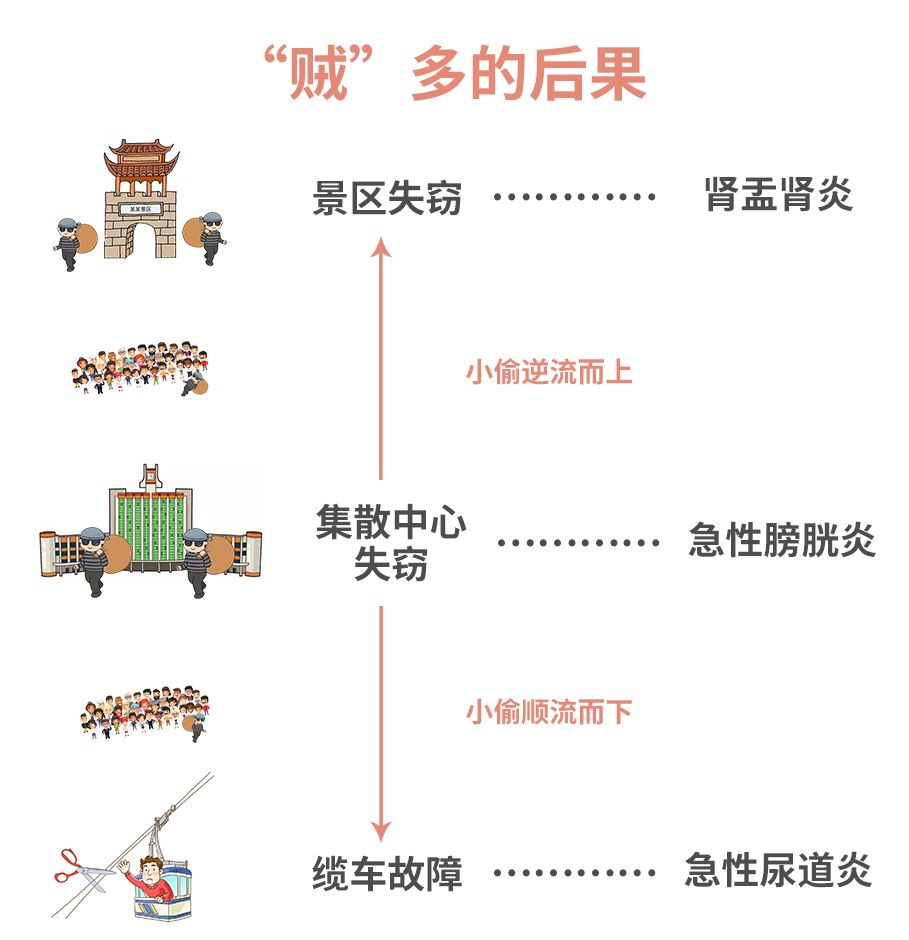 小偷(细菌)造成的损失(炎症),我们统称为泌尿系统感染。其中最严重的是肾盂肾炎,严重威胁着肾脏健康。