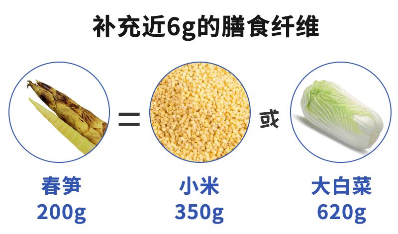 笋的特点,刚好可以弥补这一不足。一天吃200g的春笋,就能补充近6g的膳食纤维,相当于350g小米,或620g大白菜!