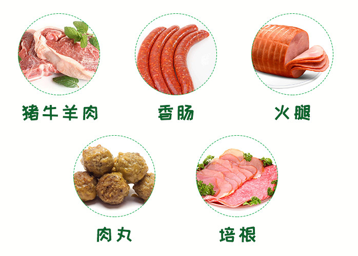 红肉指猪、牛、羊、兔等肉,加工肉指香肠、火腿、肉丸等以肉为原料制成的食品。
