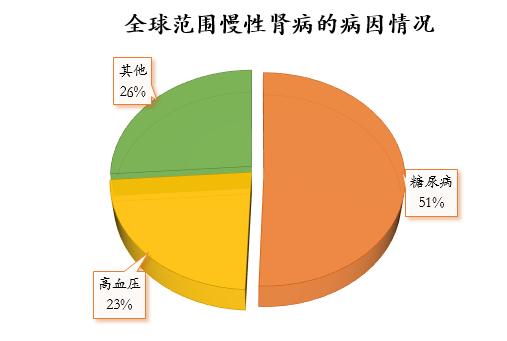 研究显示:全球范围内,糖尿病(50.62%),高血压(23.26%)是造成慢性肾病的主要病因。