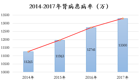 据中华医学会肾脏病学分会公布的数据显示:中国肾病患者在2014-2017年间逐年递增,2017年慢性肾病人数达到13300万人。