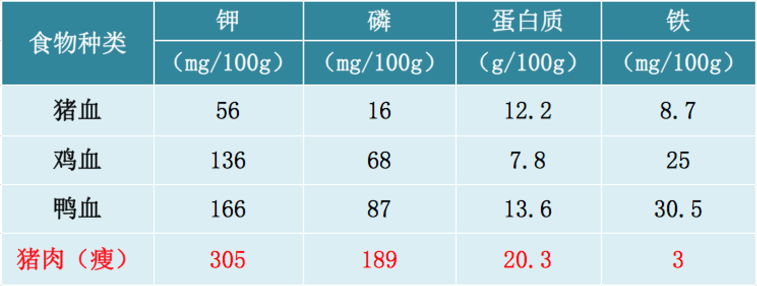 从上表中可以看出,和猪肉相比各种血制品的钾、磷、蛋白质含量都要低一些,而铁含量却相当的高。所以建议: