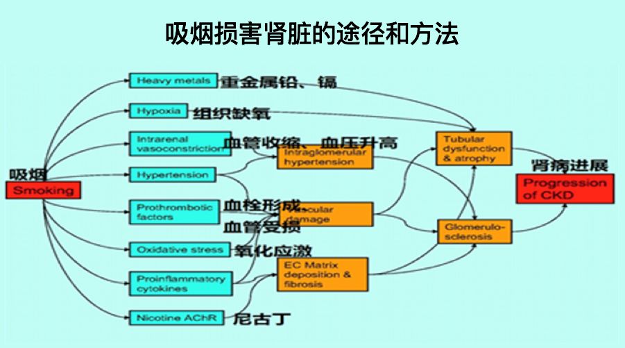 烟草燃烧产生的尼古丁、重金属(铅、镉)等有害物质,通过升高血压、血管受损等途径,加快肾病进展。