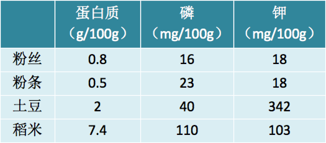 从营养学的角度来看,这些粉丝、粉条的营养成分都是相似的;因为在加工过程中,通过成熟的工艺,能够将大部分的蛋白质、磷、钾都去除了。剩下的部分主要是淀粉,非常适合肾友。