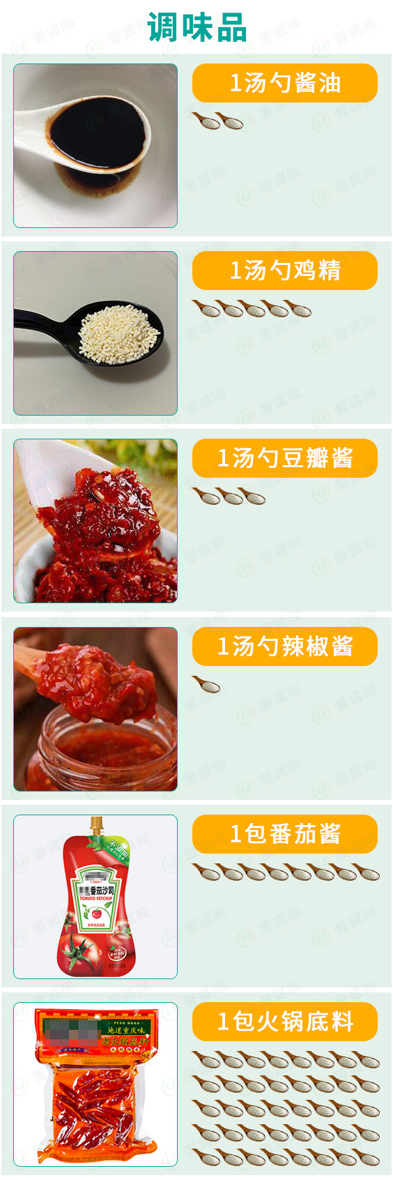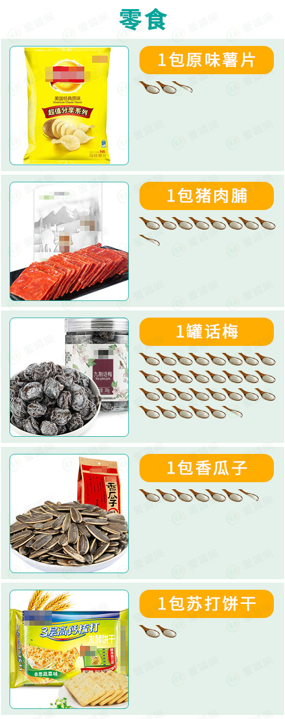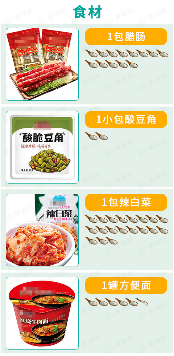 为了更形象的展示食物中的盐含量,我们将用盐勺来表示食物中的盐含量。