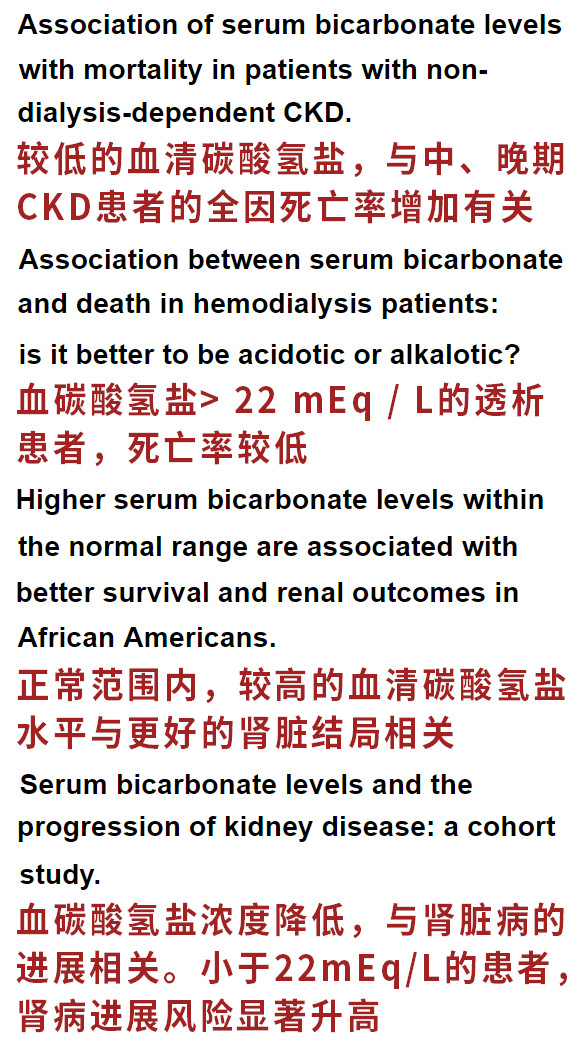 这些研究证明:血碳酸氢根浓度降低,可加速肾功能衰竭,以及升高死亡风险。