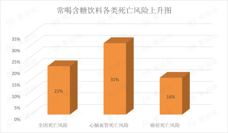 爱喝含糖饮料(≥2杯/天)比不喝(≤1杯/月)人群全因死亡风险高出21%,心血管疾病死亡风险提高31%,癌症死亡风险提升16%。