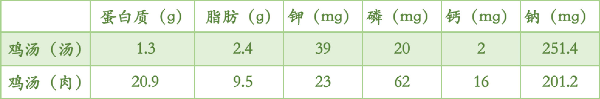 从下表可以看 ,鸡汤中蛋白质、钙等营养成分含量很低,而钾、磷、钠、脂肪、嘌呤等对肾友不利的成分却较高。