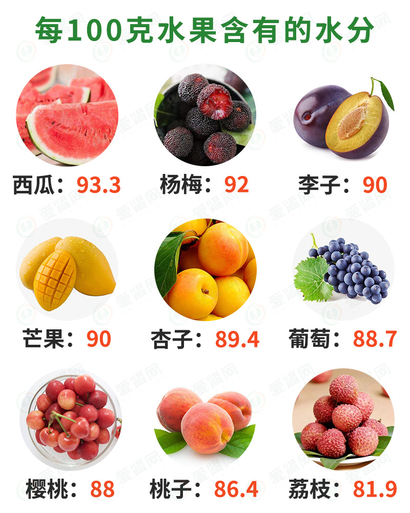 水果中含有大量的水,因此,透析或水肿的肾友,如果已经吃了较多水果,要相应减少饮用水的量,尤其是西瓜、杨梅等含水量很高。