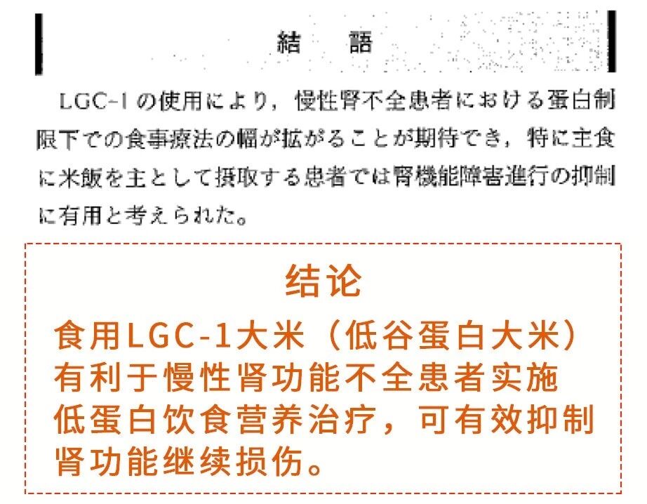 用低谷蛋白大米(日产LGC-1)代替普通大米,能降低肌酐水平,是对慢性肾脏病患者有益和有效的食品。