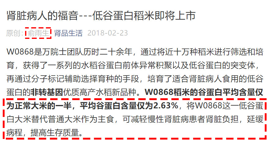 爱肾网今天查证了中国知名肾内科专家、南京军区总医院俞雨生教授的自媒体平台,也曾建议用低谷蛋白大米代替普通大米。