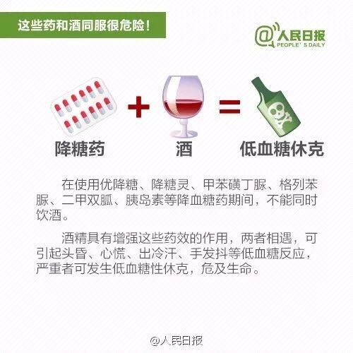 注射胰岛素或服用氯磺丙脲、甲苯磺丁脲等磺脲类降糖药,不能饮酒,更不能空腹饮酒,否则可能会产生很严重的低血糖反应,表现为心慌、出汗、疲乏无力,甚至烦躁、意识混乱、多语等。