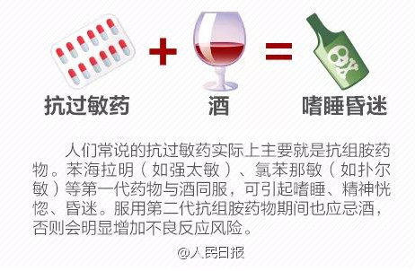 过敏的发病率很高,文献报道约有l/3的人在一生中患过过敏性疾病。而抗过敏药主要是抗组胺药物,服药过后饮酒容易造成嗜睡昏迷。