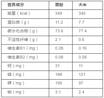 面粉的营养成分普遍高于大米(碳水化合物除外),整体含量相差不是很大,区别较大的在蛋白质、不溶性膳食纤维和矿物质上。