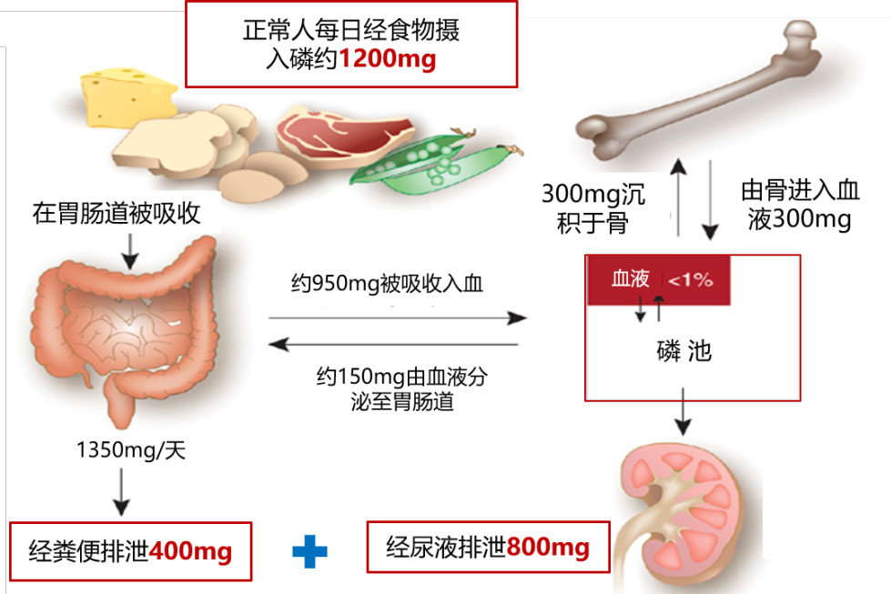 正常成人每日饮食大约含磷1~1.5g,这些含磷物质在消化酶的作用下水解并被肠道吸收,吸收率为65%~70%2,经肠道吸收后的磷会进入机体参与代谢。