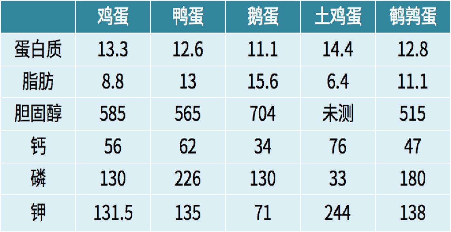 鹅蛋的蛋白质含量最低,脂肪、胆固醇含量最高;