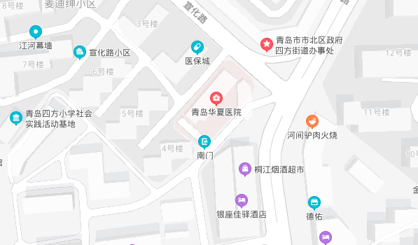 山东省青岛市市北区宣化路80号华夏医院(公交路线:7路、21路、206路环线、322路、624路、765路宣化路站下车)