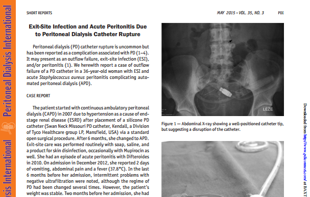 腹膜透析导管破裂引起的出口部位感染和急性腹膜炎(英文)