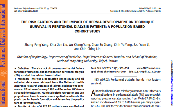 疝气发展对腹膜透析患者生存的危险因素及影响:基于人群的研究(英文)